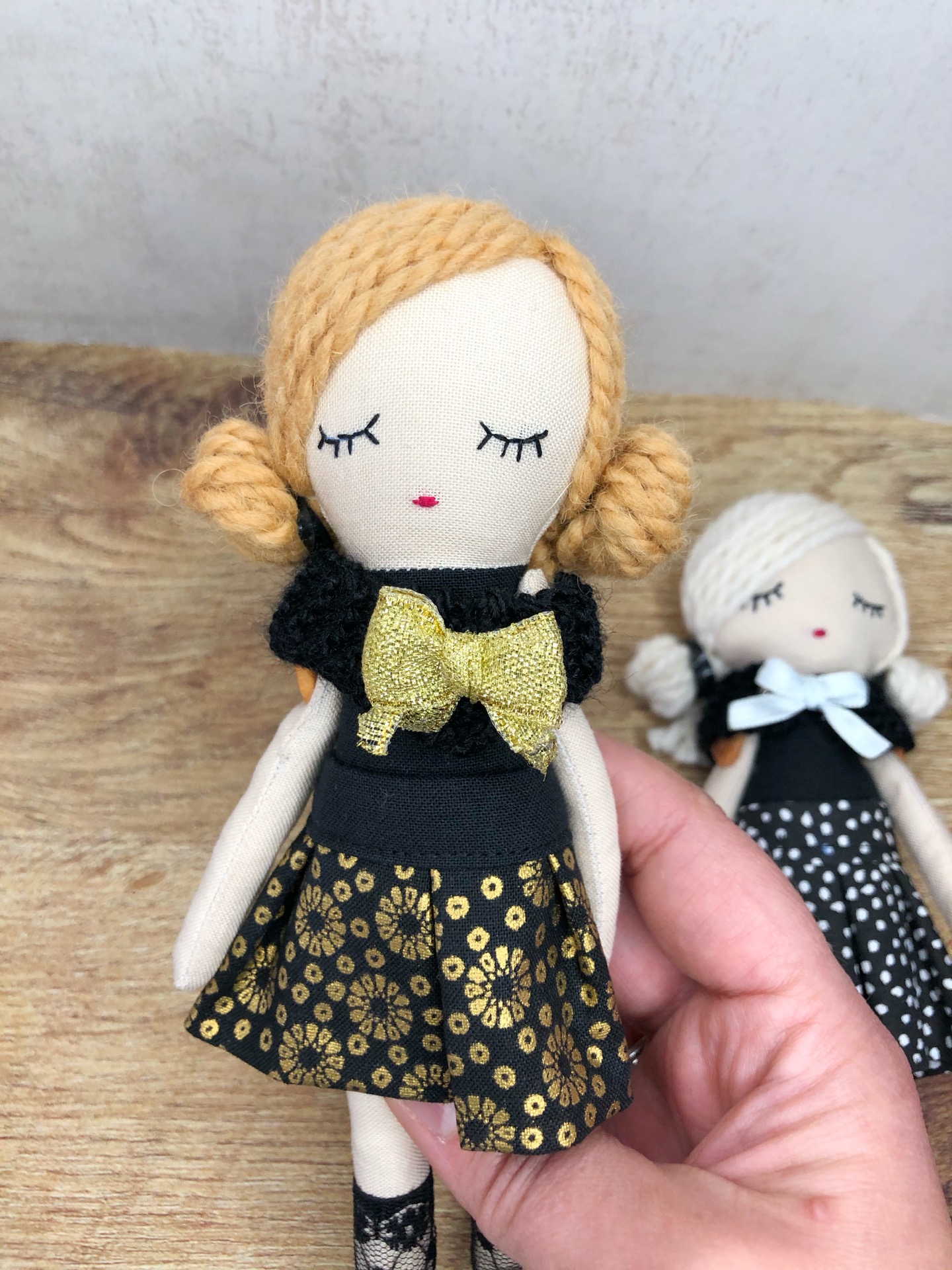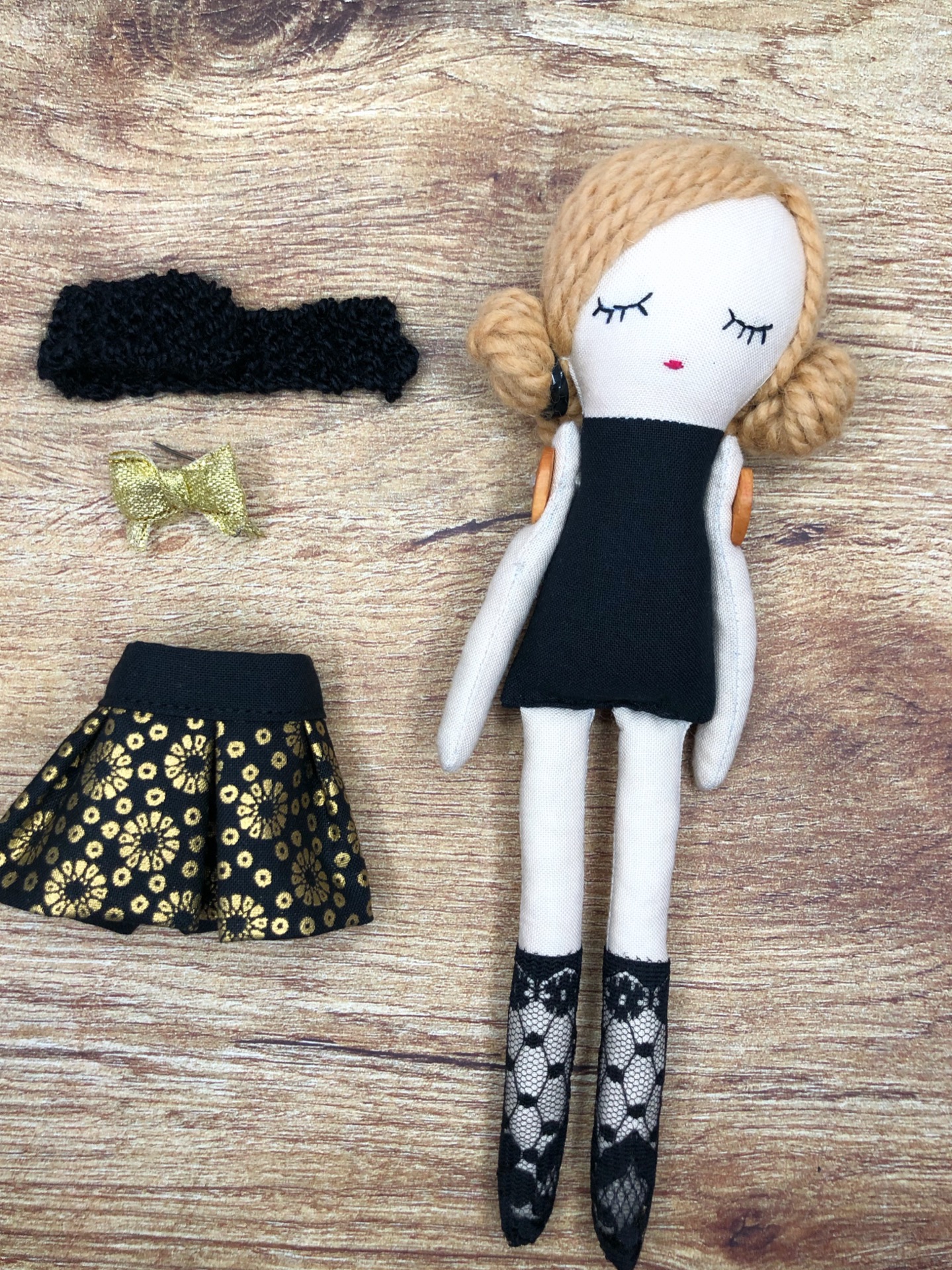 Muñeca de tela de 21 cm aproximadamente. Tiene una falda que puedes quitar y poner y una bufanda que también se le puede quitar. El lazo que adorna el cuello de lana es un broche.