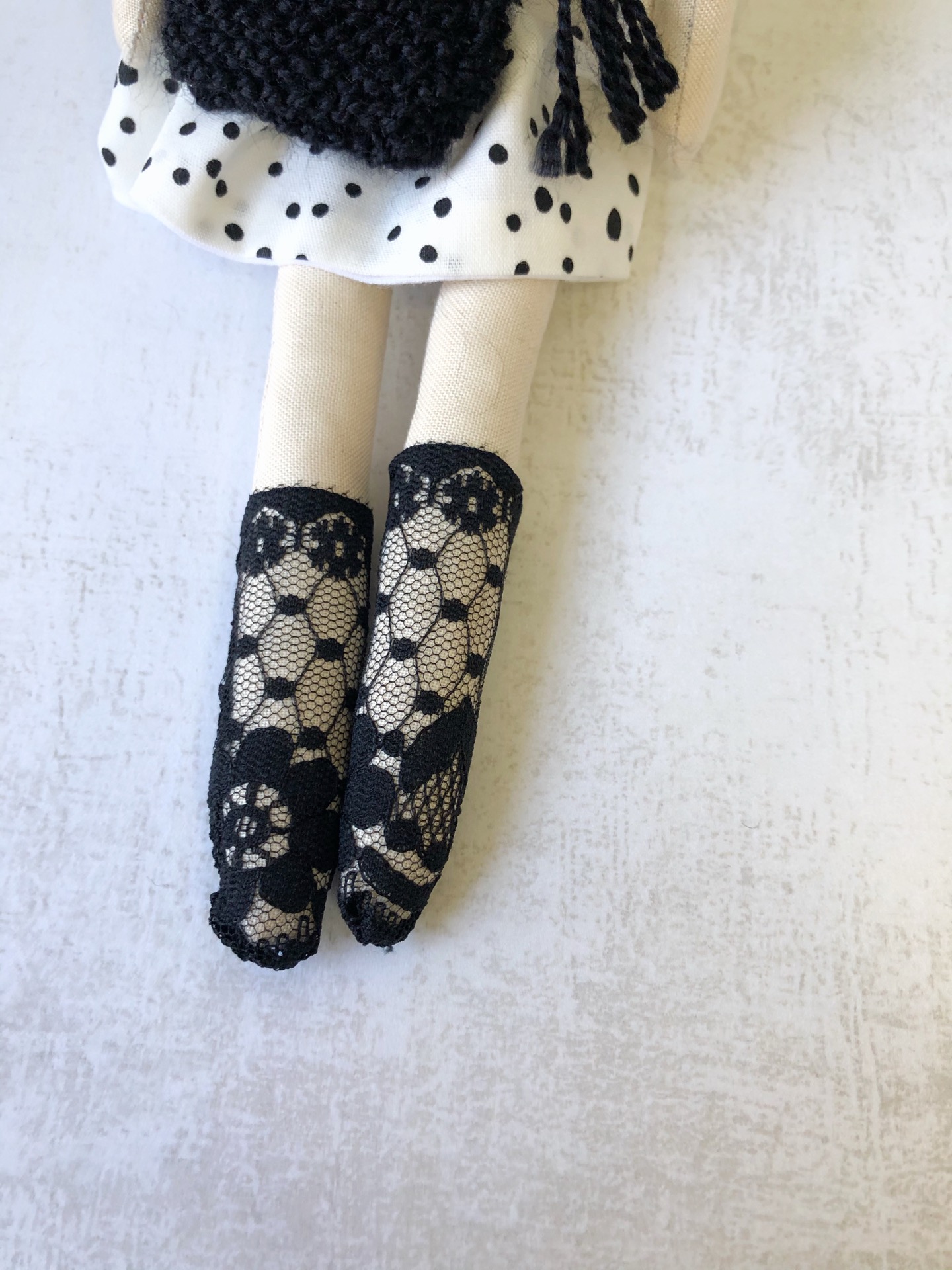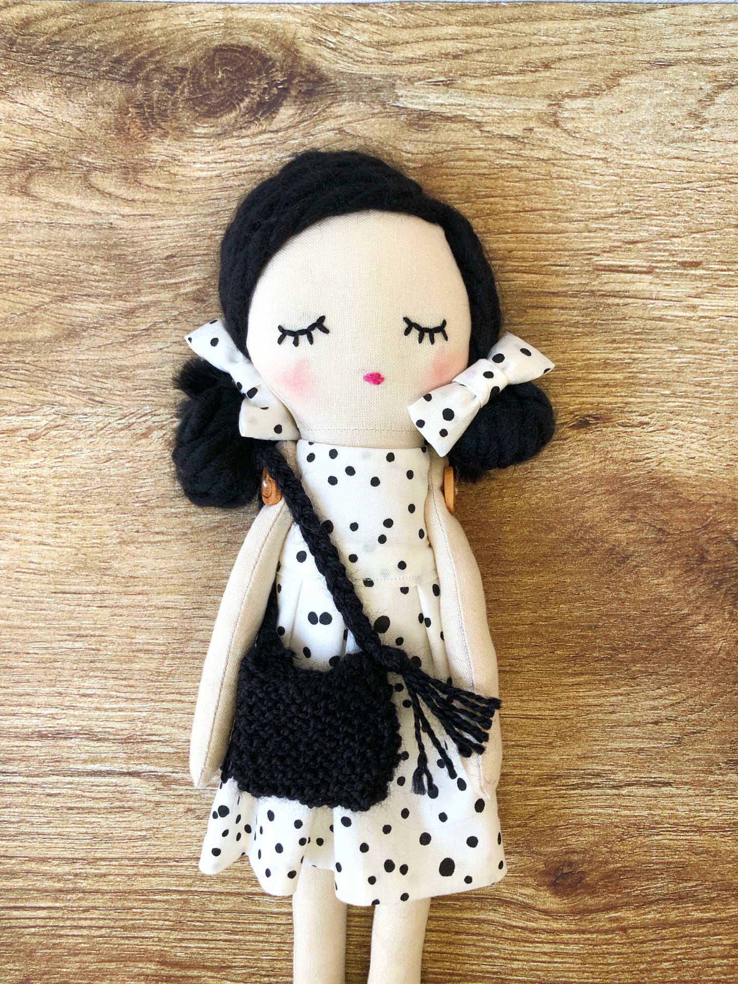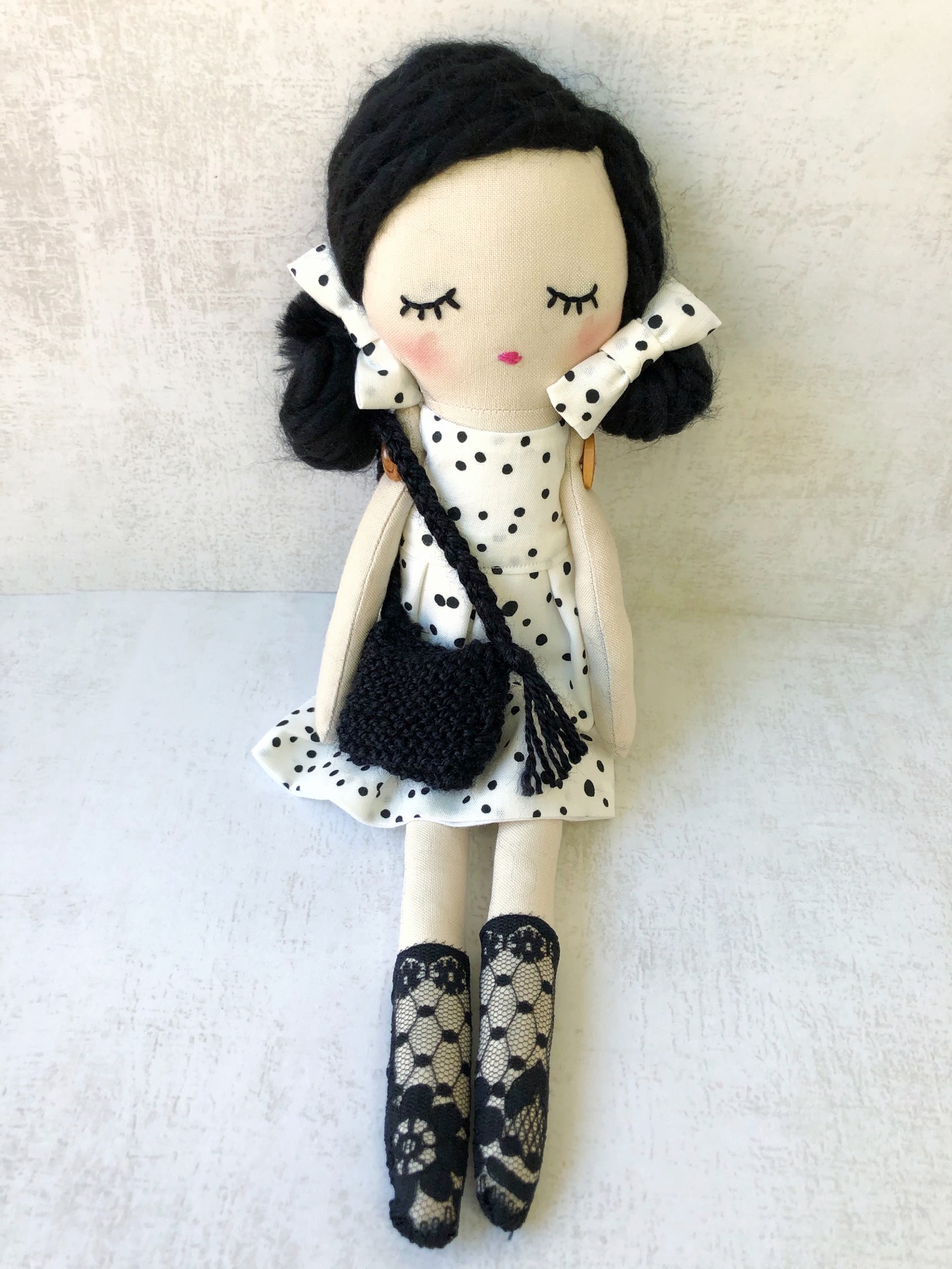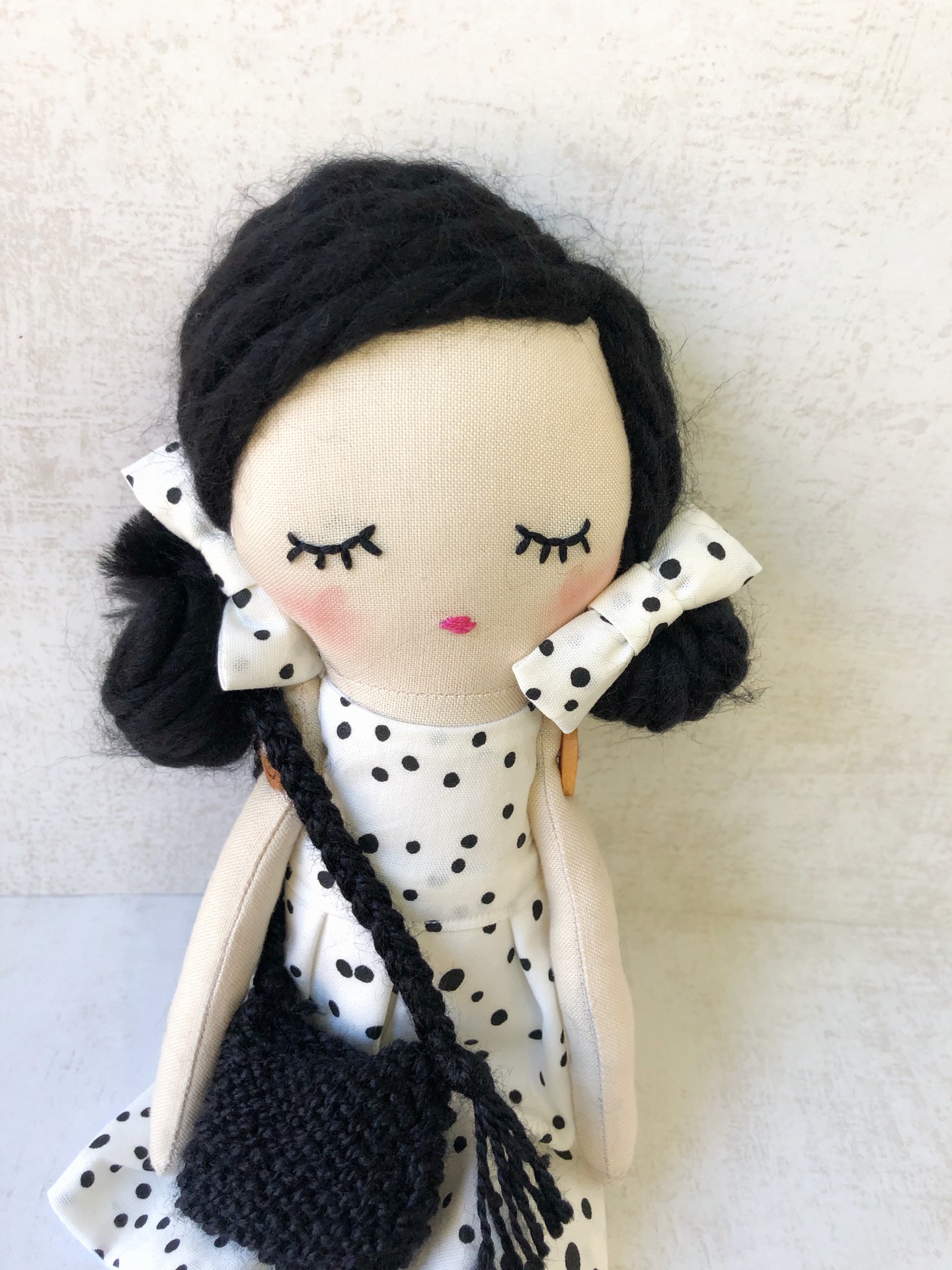Muñeca de tela que mide 30 cm aproximadamente, está confeccionada en tela de algodón y tiene un vestido que puedes quitar y poner.